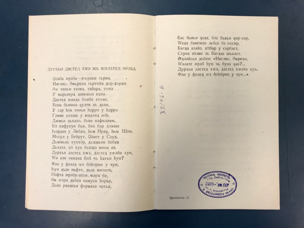 The Kurdish materials from Armenia are fascinating for a whole host of reasons. To begin with, hundreds of titles were published from the 1920s onwards, including when doing so in the rest of the Kurdophone regions was either severely restricted or harshly suppressed. This made the Soviet Caucasus one of the few places in which a continuous and relatively unhindered flow of Kurdish publishing was possible. After Soviet authorities imposed the Cyrillic alphabet on Kurdish in 1945 (after 15 years of Latinization), it also meant that a sizeable proportion of Kurdish publishing was conducted in a writing system unfamiliar to the vast majority of Kurdophones, most of whom now use modified Latin or Arabic scripts. After independence, Armenian’s Kurdophone communities quickly opted for Latinization, bringing them into line with practices in most other Kurmanji-speaking regions. Kurdish children in Armenia are today taught using textbooks in this system, ensuring a generational shift. Nonetheless, Cyrillic-script works remain an important part of their cultural heritage. At the same time, they act as a testament to the wholehearted approval of Soviet authorities for the use of Kurdish as a medium of spreading Soviet thought and authority, in addition to expanding Soviet cultural clout.