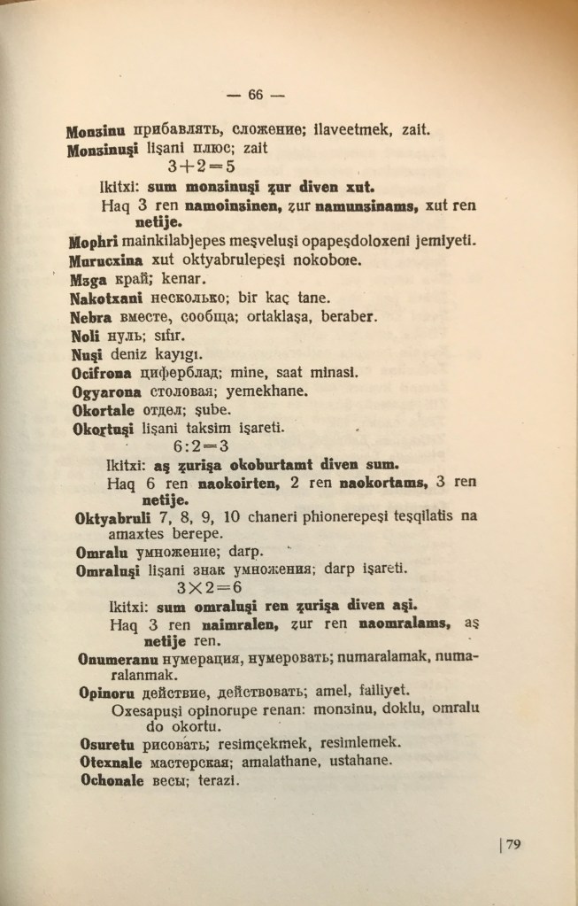 Perhaps the most valuable aspect of the work, however, comes at the end. Here, the efforts of both Chitaşi and Aleksişi have combined to produce a comprehensive glossary of mathematical terms in Lazuri matched to Russian and Turkish equivalents, or explained in Lazuri. It is this way that we learn that “opinoru” means an action or activity, and “ochonale” scales. As I explored in an earlier piece on the 1970s Iraqi Assyrian periodical Múrdinā Atúrāyā, one of the great challenges for any activist seeking to promote the use of a minority language in all aspects of social life is to encourage the adoption of endogenous terminology when exogenous vocabulary is so readily available. This textbook was obviously not just a means of providing first-language education to monolingual Laz children. It was also intended to create the basis for a new generation of Laz to operate in contemporary Soviet society without the need for Russian or Georgian. Given the intense assimilationist pressures faced by minority groups in the Republic of Turkey, it is unlikely that there is a sizable community of monolingual Laz children who might replicate such conditions today. But Chitaşi’s goal is no less pertinent to Laz living in Turkey than it was to the Soviet community in the 1930s. Greater effort might be needed, but such works still do open the door to alternate possibilities for linguistic and cultural autonomy.