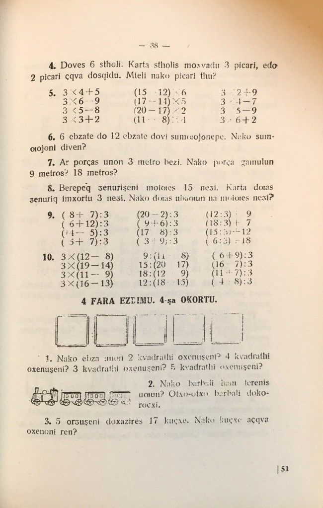 The facsimile, based on an original copy held in the library of BULAC in Paris, was published by GeoAktif Yayınları in 2012. At 240 pages, the vast majority of which are copies of the original work, it is a fairly comprehensive textbook for anyone looking to study basic mathematics. It contains copious illustrations, all of which are a reminder of some of the wonderful drawings and sketches that accompanied children’s pedagogical works across the Soviet Union. The work was produced in the Uniform Alphabet, a compendious Latin script that was imposed on a wide swathe of the languages spoken across the Union in the late 1920s. The Uniform Alphabet, when applied to Lazuri, requires the use of a subset of characters that is wholly reminiscent of contemporary Turkish orthography, resulting in a text that is in no way strange or unsettling to those who are used to materials produced in the Republic of Turkey. This is especially fortunate given the close correlation between the Lazuri alphabet currently promoted by activists in Turkey and Germany, and the script adopted by Atatürk in 1928.
